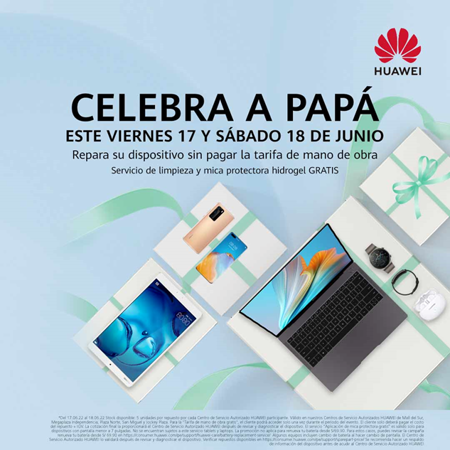 Entre el viernes 17 y sábado 18, HUAWEI regala la oportunidad de reparar el celular de papá de una forma más accesible. En los Centros de Servicio Autorizados HUAWEI (Mall Del Sur, MegaPlaza, Jockey Plaza, Plaza Norte y Plaza San Miguel; los usuarios podrán reparar el equipo de papá con dos grandes regalos: